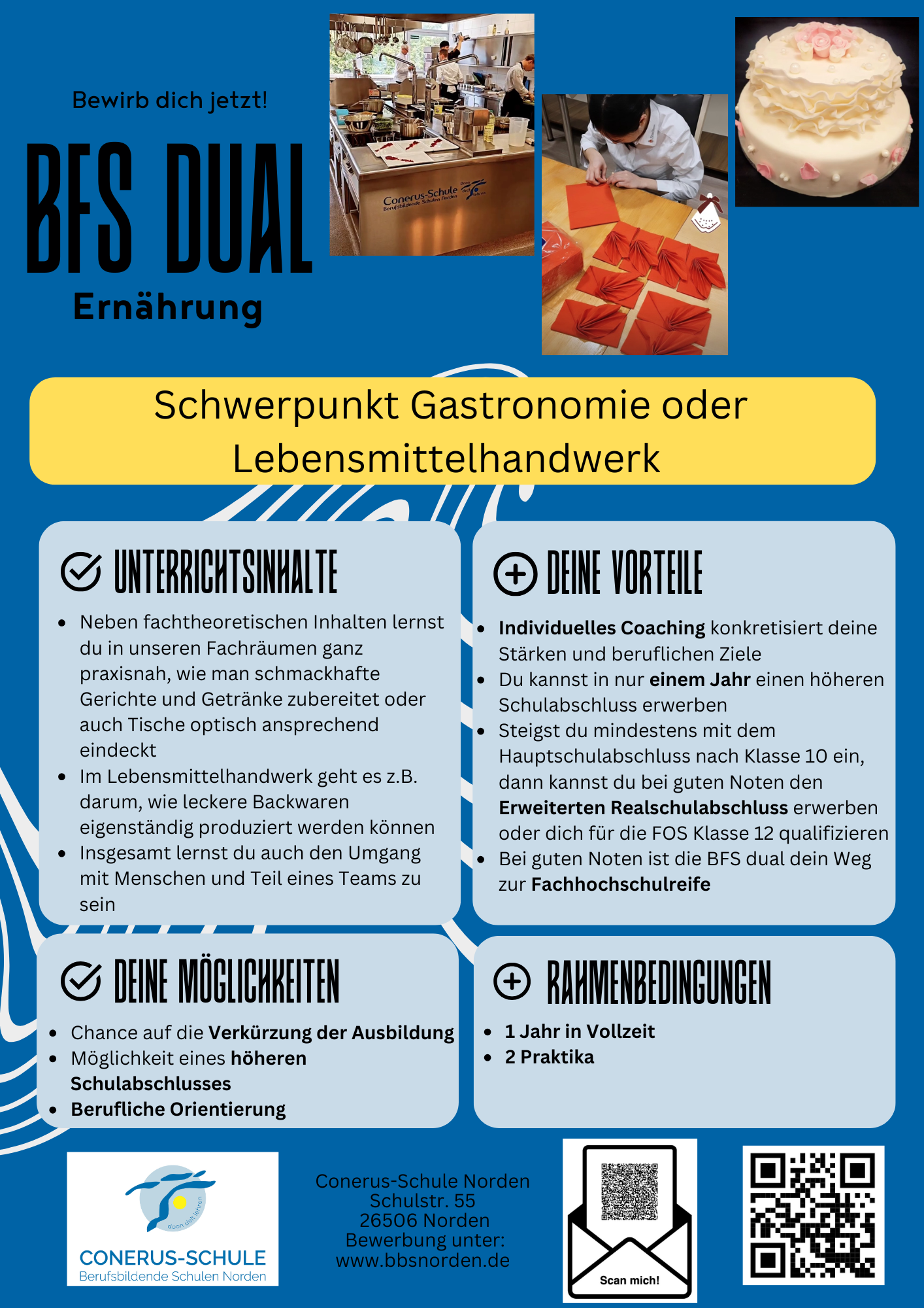 Die Berufsfachschule dual (BFS dual) vermittelt für anerkannte Berufe im Berufsfeld Ernährung in einem einjährigen Bildungsgang eine qualifizierte berufsfeldorientierte Grundbildung.